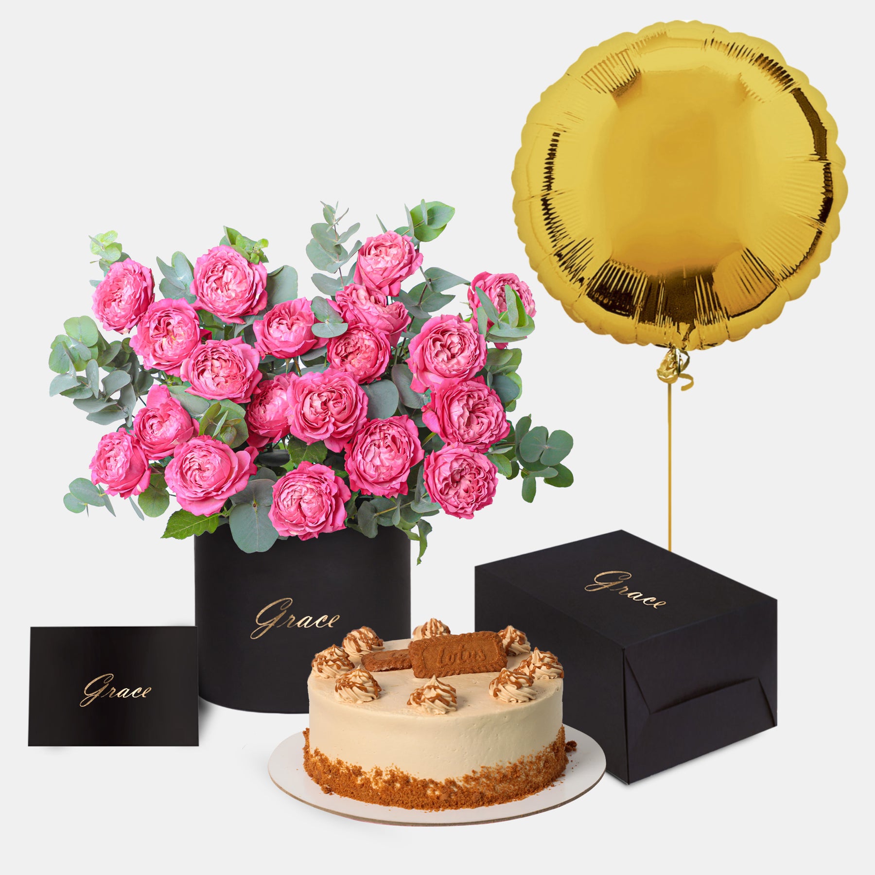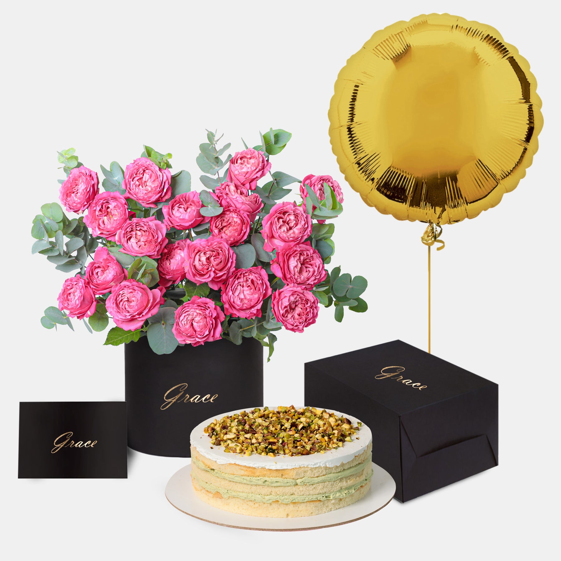 Celebrate special moments with our Julieta Spray Pink in Box with Cake Bundle, featuring delicate pink roses and a delicious cake for an unforgettable gift experience.