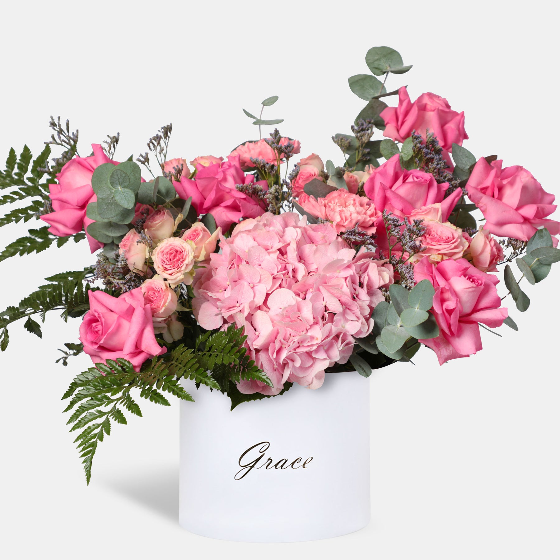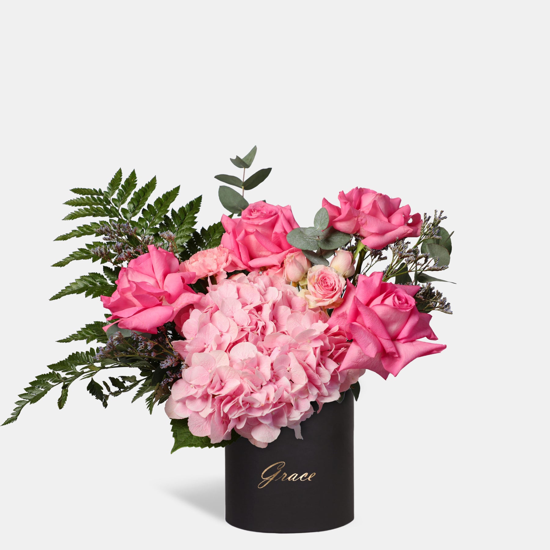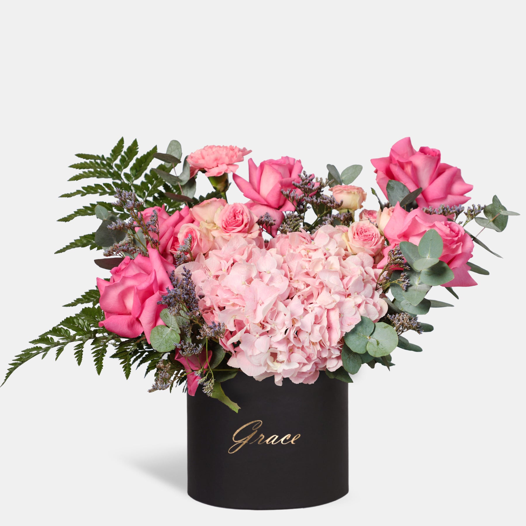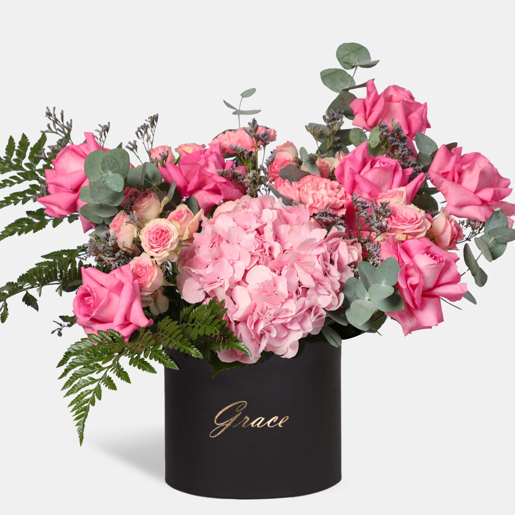 The Blessing Box is a delightful floral arrangement filled with a mix of Hydrangea Pink, Pink roses, Carnations, Eryngium, Spray roses, Areca Palm, Eucalyptus, Astilbe, and Limonium.