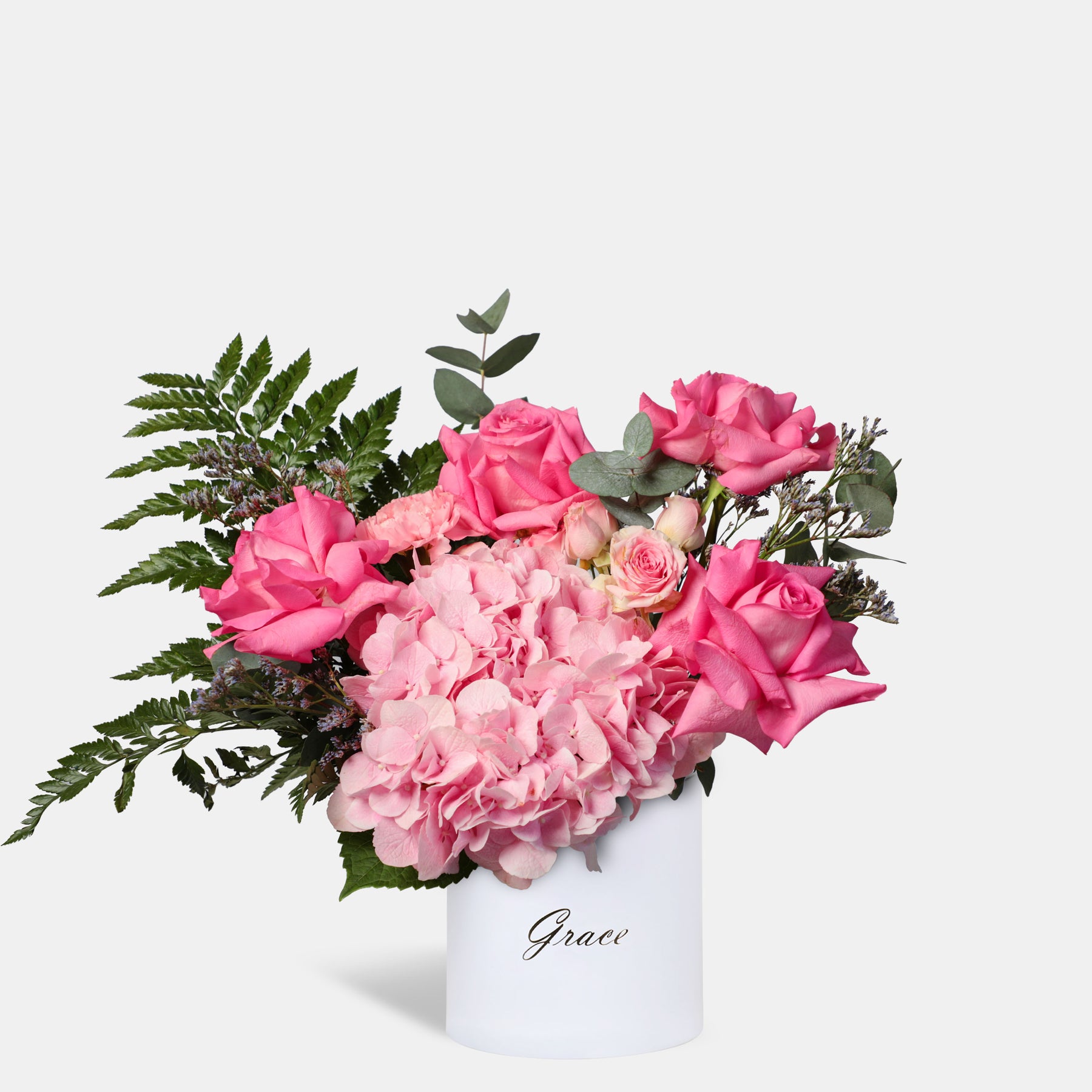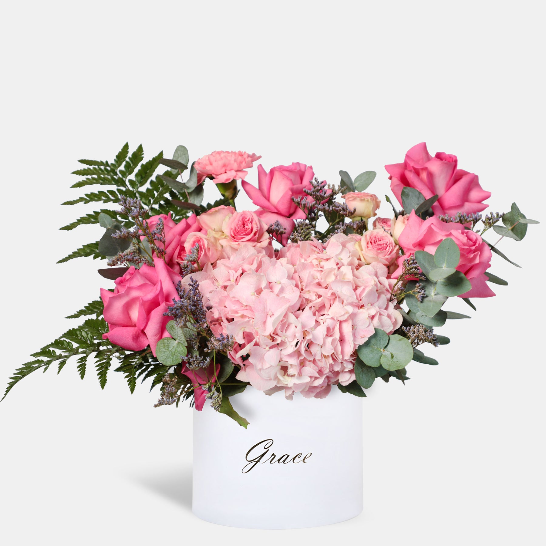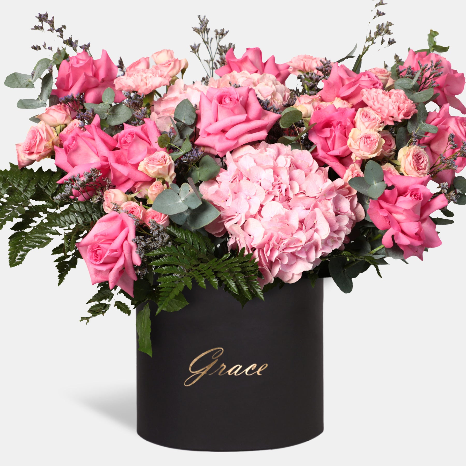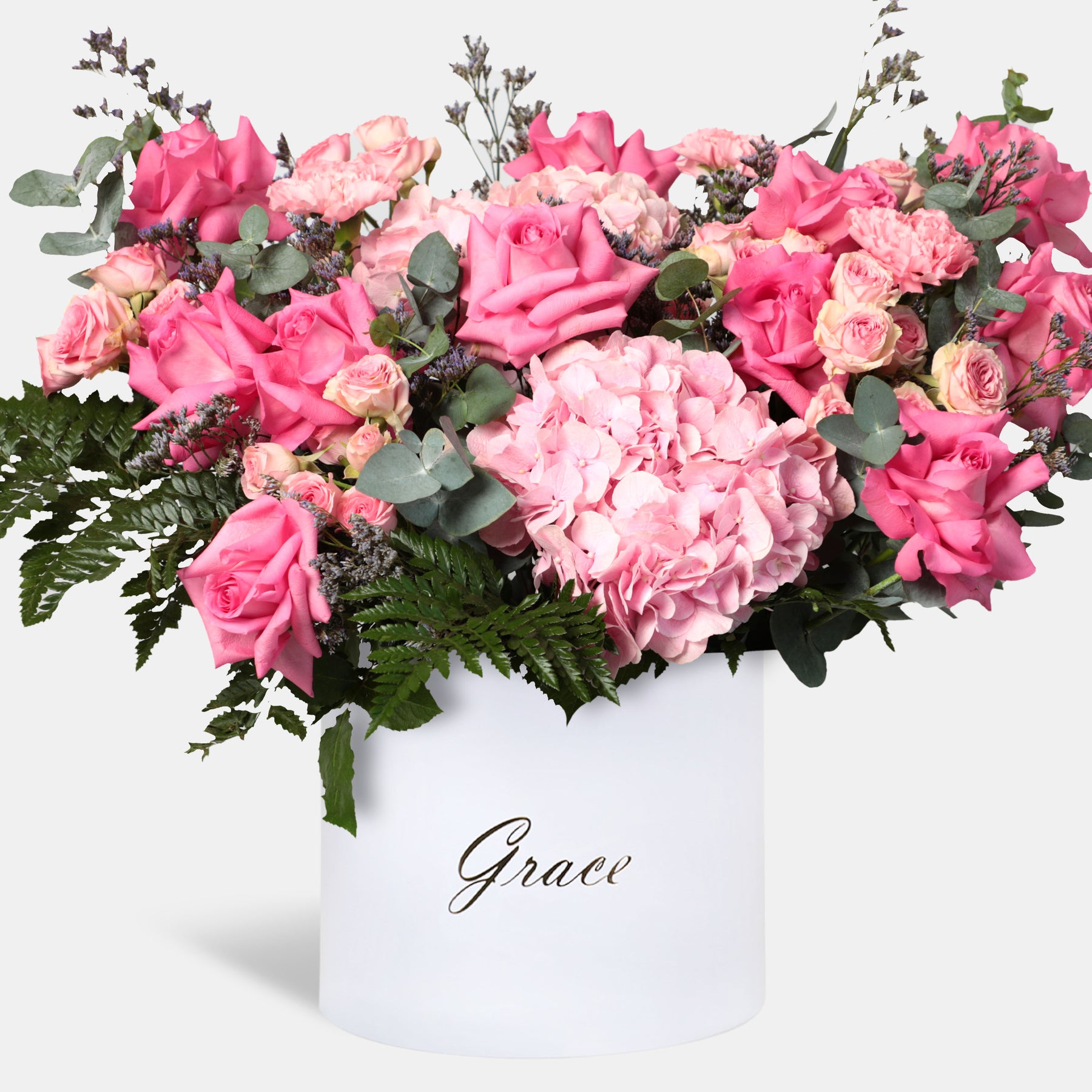 The Blessing Box is a delightful floral arrangement filled with a mix of Hydrangea Pink, Pink roses, Carnations, Eryngium, Spray roses, Areca Palm, Eucalyptus, Astilbe, and Limonium.