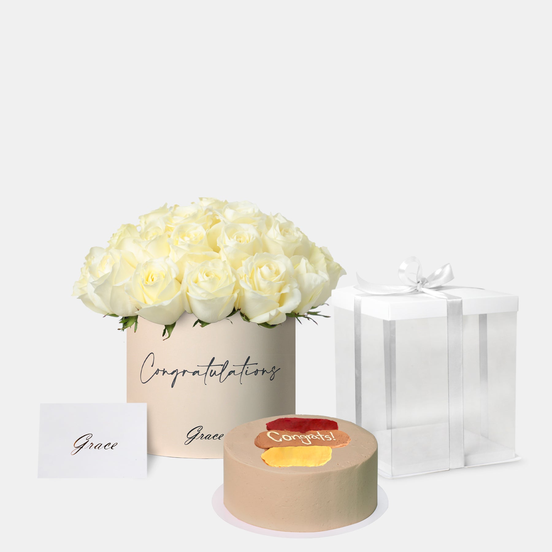 Celebrate success with our Well Done arrangement, featuring elegant white roses paired with a delicious cake. A thoughtful and charming gift to honor achievements and make moments extra special.