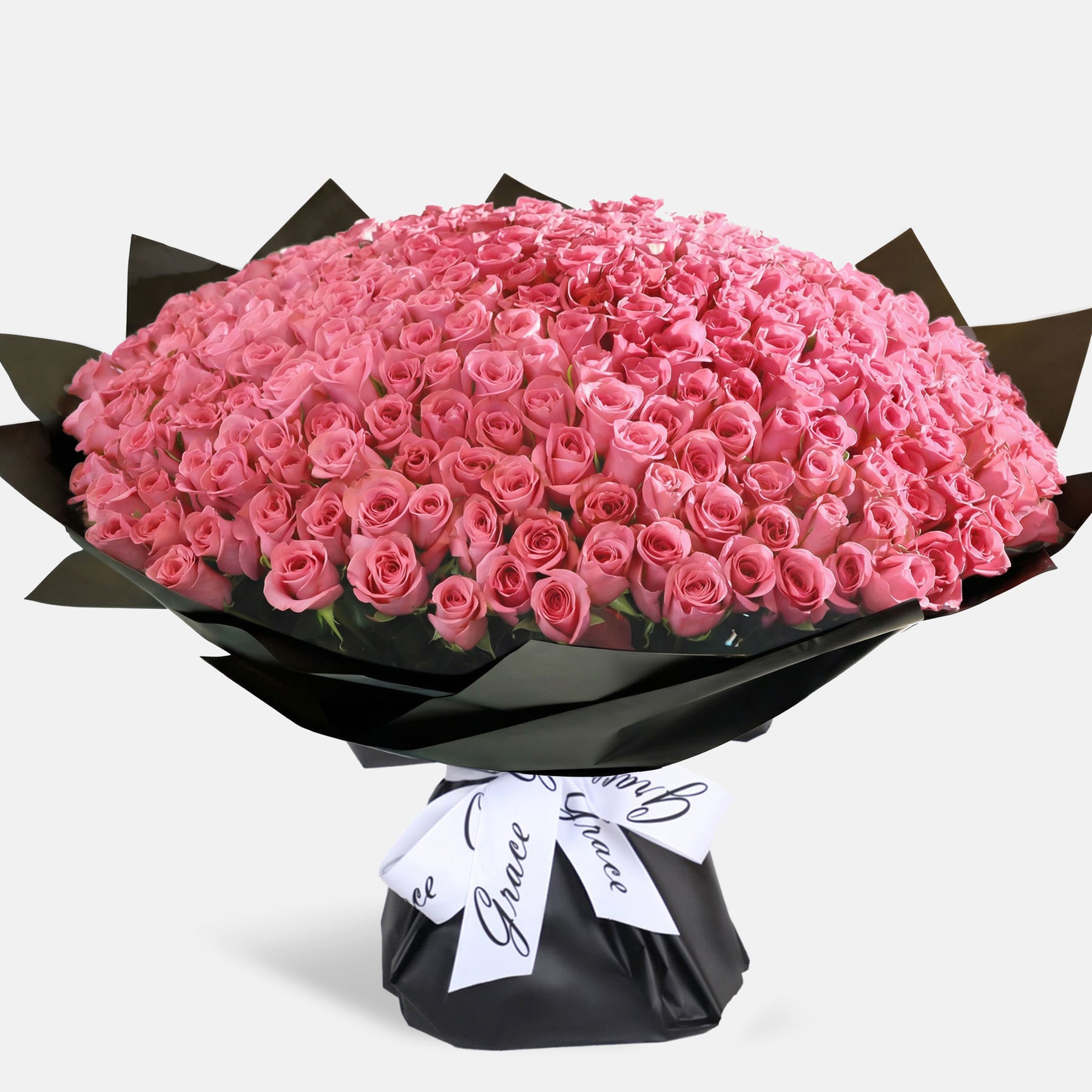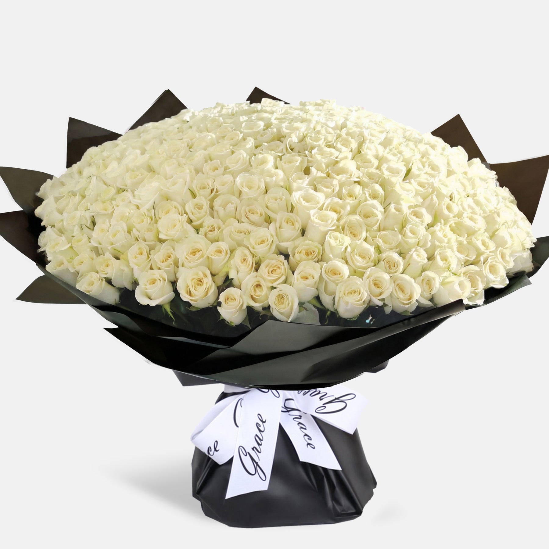 Composed of 300 premium roses, hand-arranged into a grand and perfectly rounded bouquet, this piece represents the ultimate expression of love and devotion. Wrapped in Grace’s signature black packaging and finished with an elegant ribbon, it is made for once-in-a-lifetime celebrations, bold proposals, and gestures that must be remembered forever.