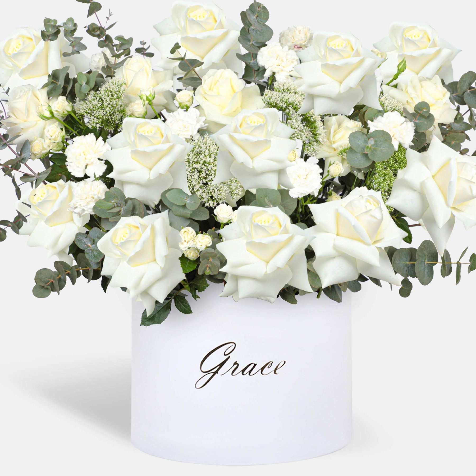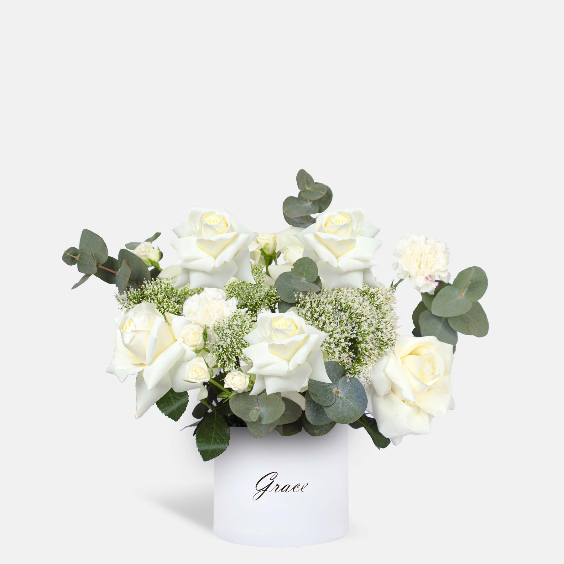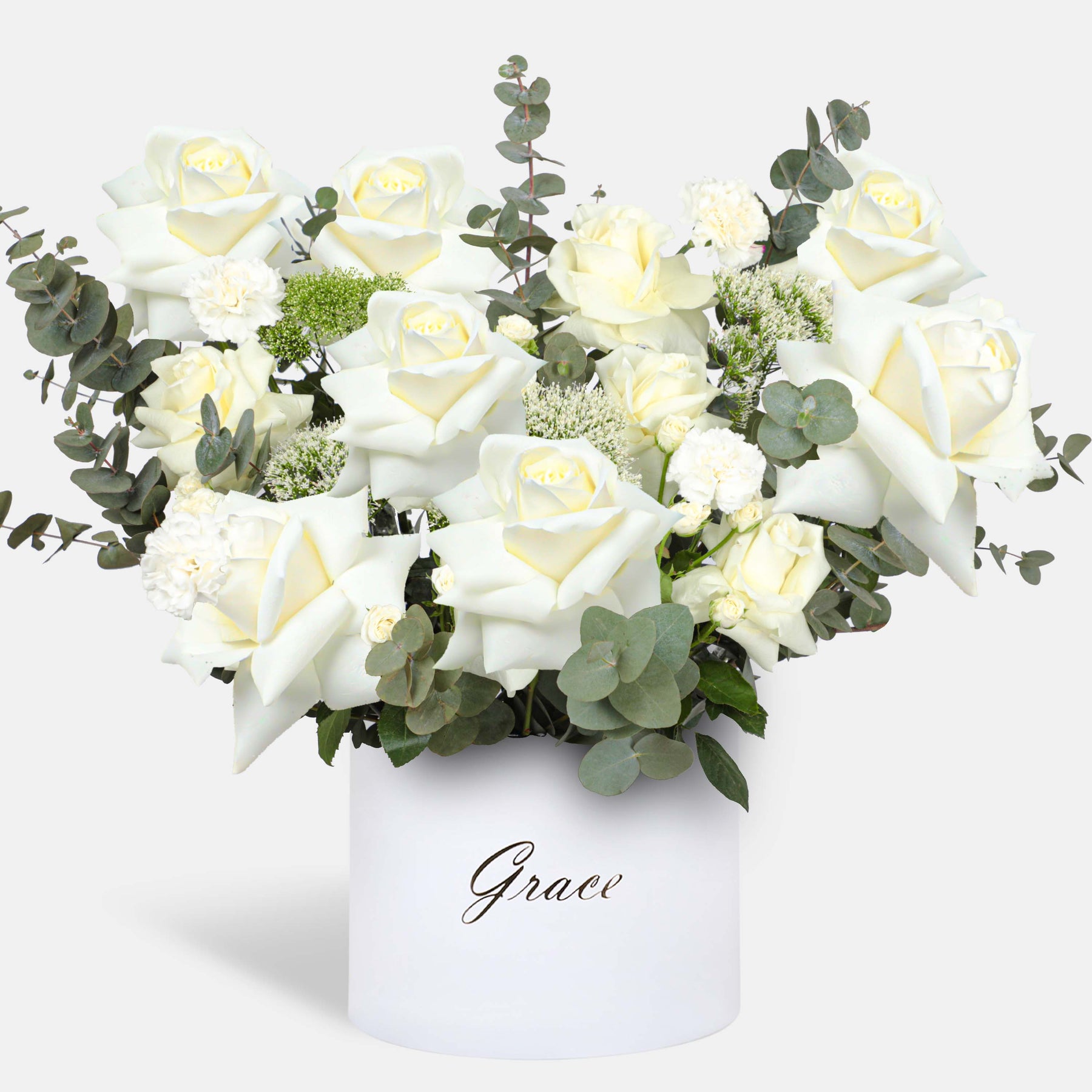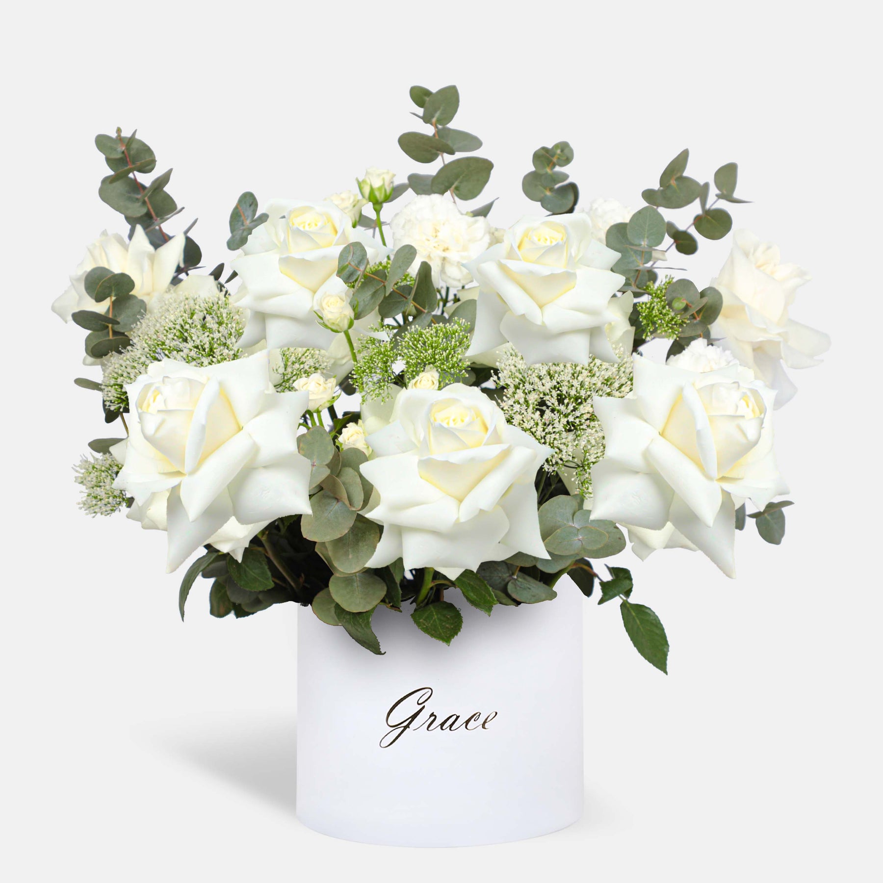 Divine Grace in a Majestic Box features a beautiful blend of Hydrangea White, White Roses, Limonium White, Skimmia Green, and Eucalyptus, elegantly arranged with 7-9 stems for a sophisticated, refined floral display.