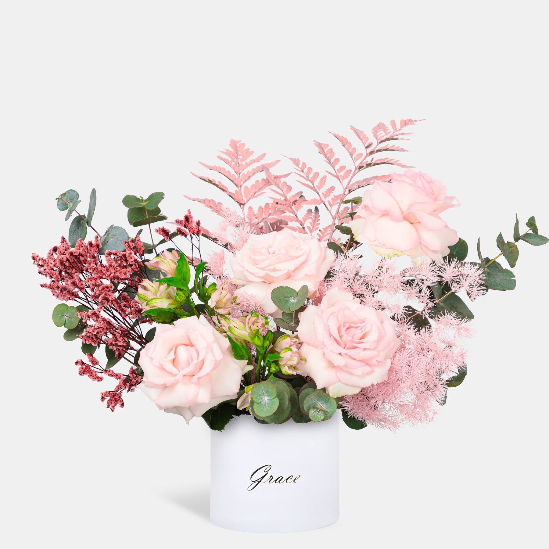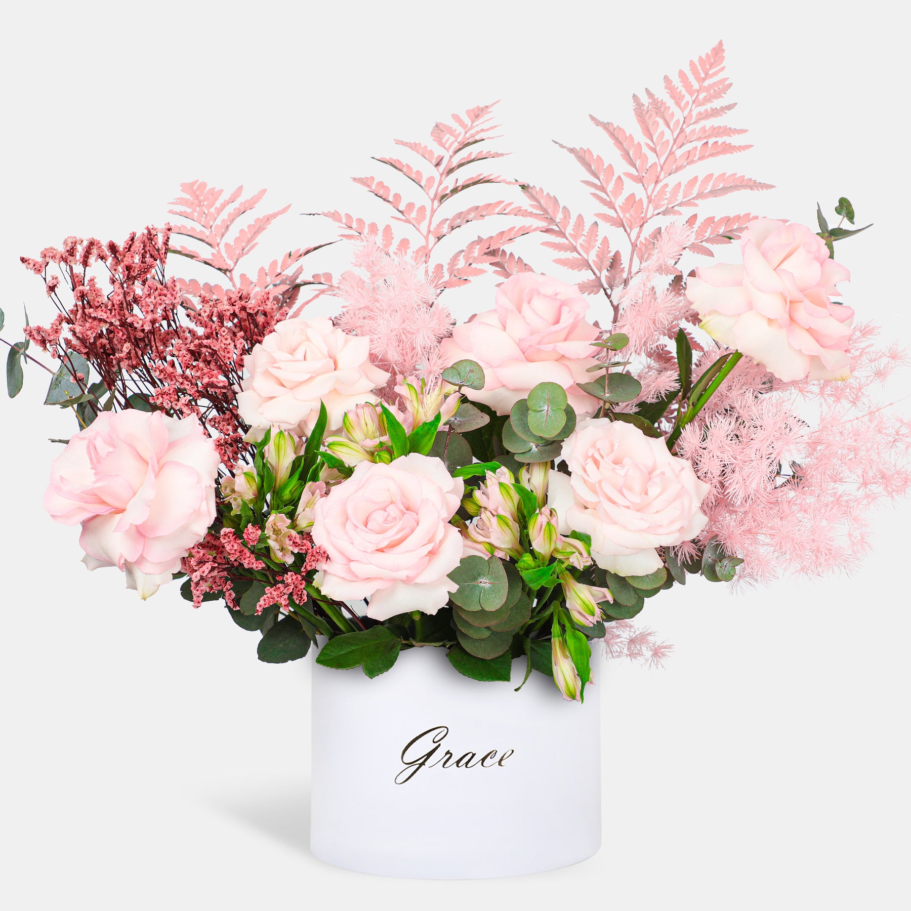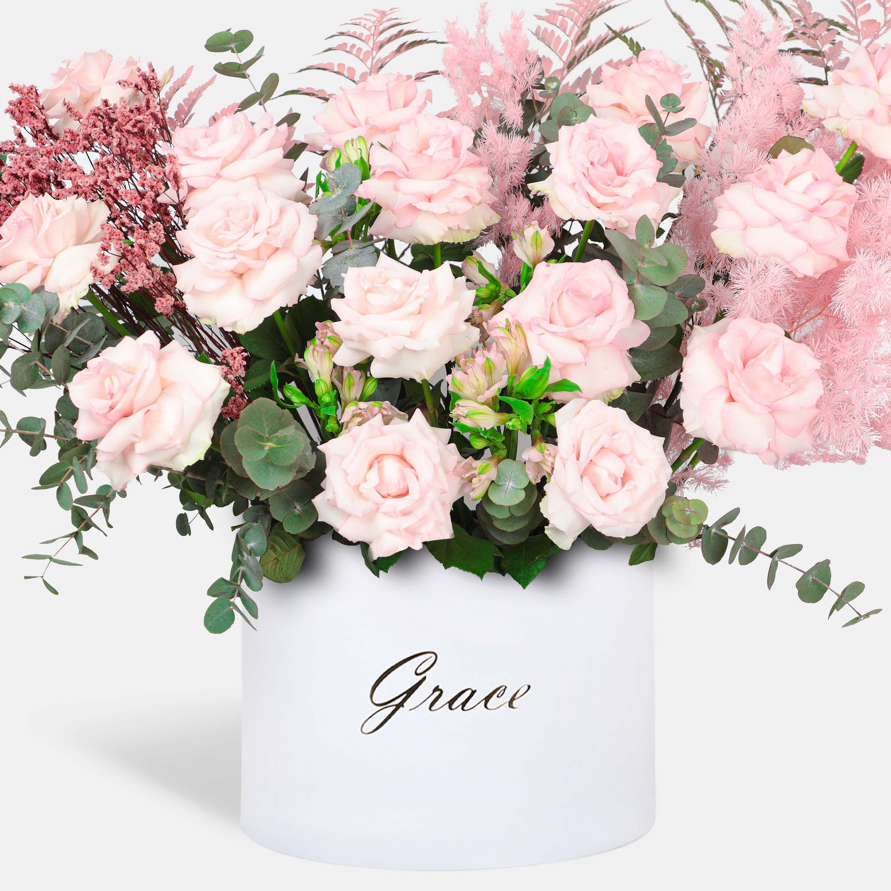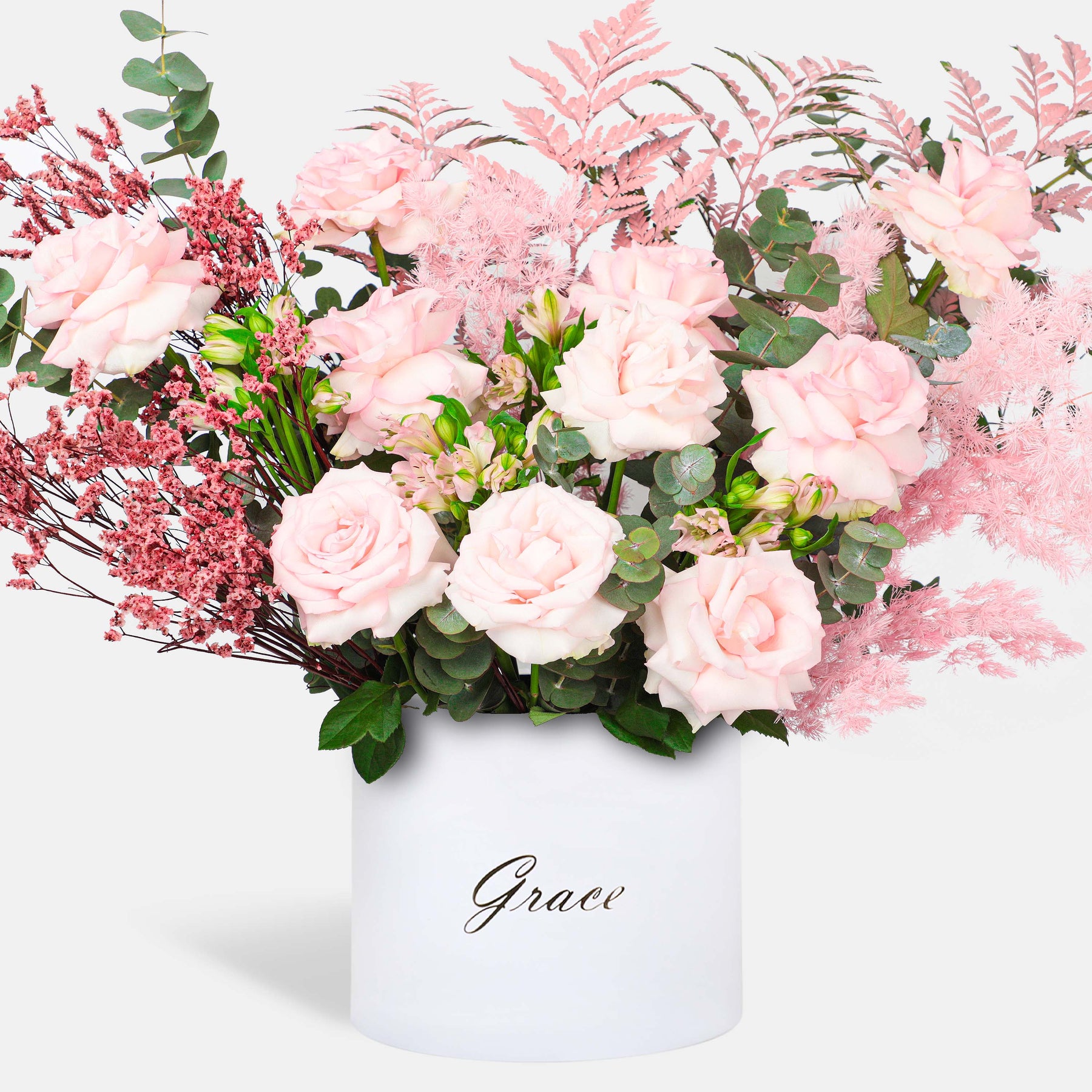 Flamingo in a Box is a graceful arrangement featuring mixed pink roses, dried limonium, dried asparagus, fresh eucalyptus, sun palm leaves, and pink alstroemeria. Beautifully styled in an elegant box, this charming floral design blends soft textures and romantic tones, creating a sophisticated statement that truly defines elegance and timeless beauty.
