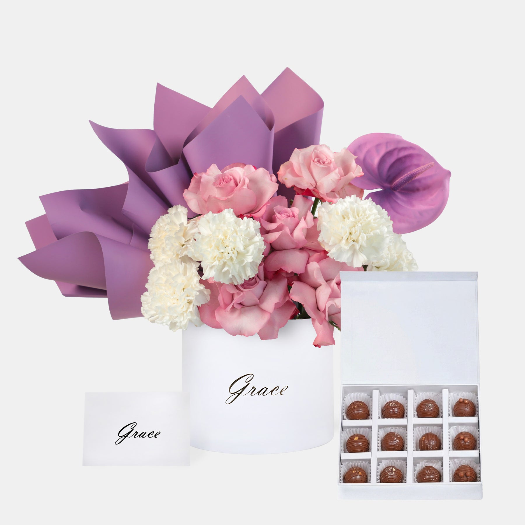 Violet Poise Chocolate Bundle is an elegant gift featuring rich, premium chocolates in blush Chocolate Box paired with soft violet accents. Perfect for expressing love, appreciation, and admiration on special occasions or heartfelt celebrations. 🍫💜